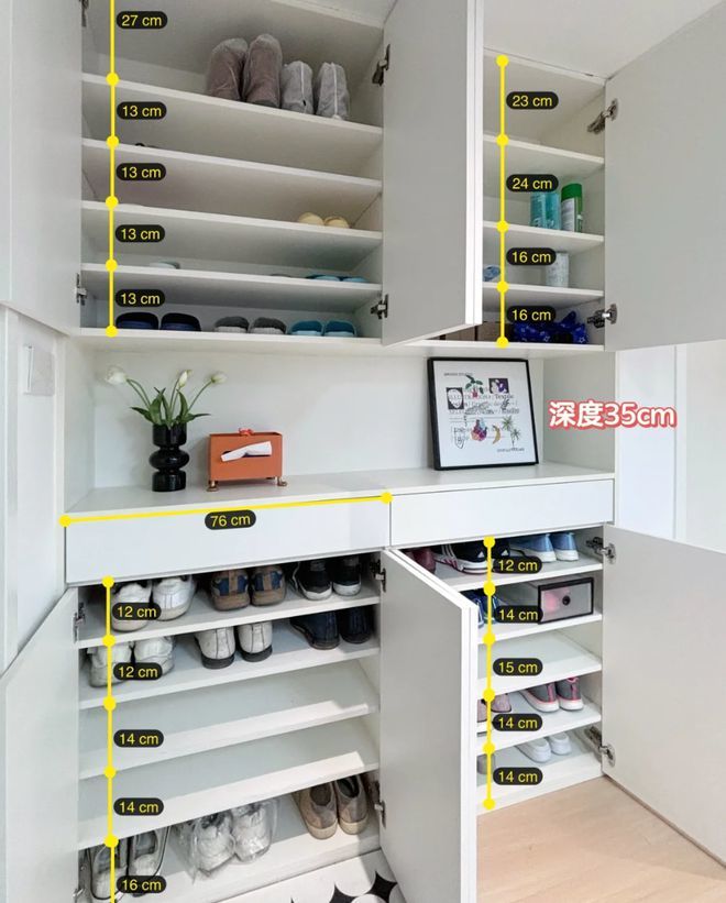 其实我家的鞋柜挺大的,虽然深度只有35cm,但宽度达到了160cm,并且考虑到了不同鞋子收纳,还设计了不同高度的隔层和结构造型。