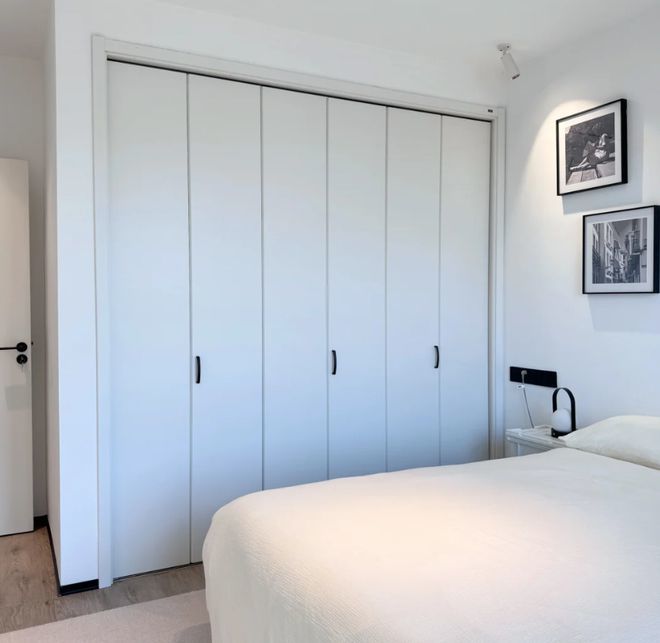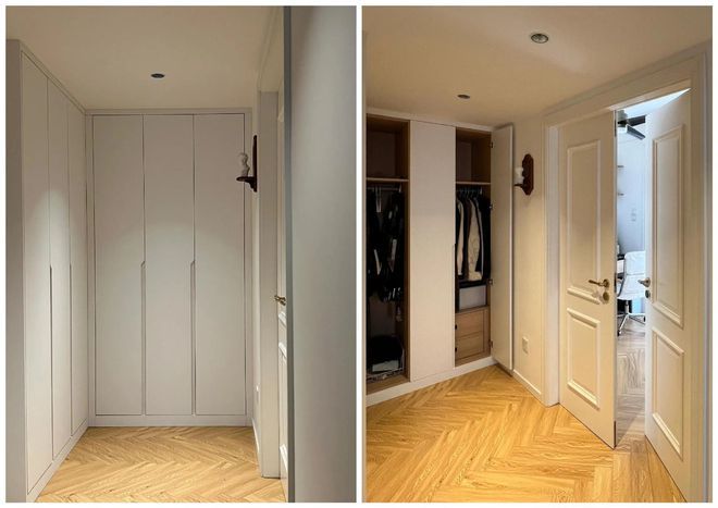 衣帽间不一定要有一个房间,若家里的过道墙体可以改造,在过道设计两组大衣柜,同样兼具衣帽间的收纳力。