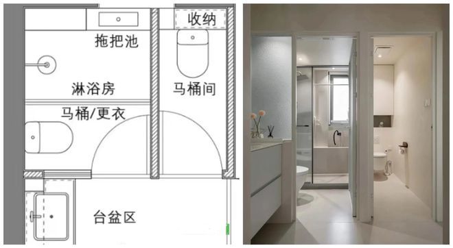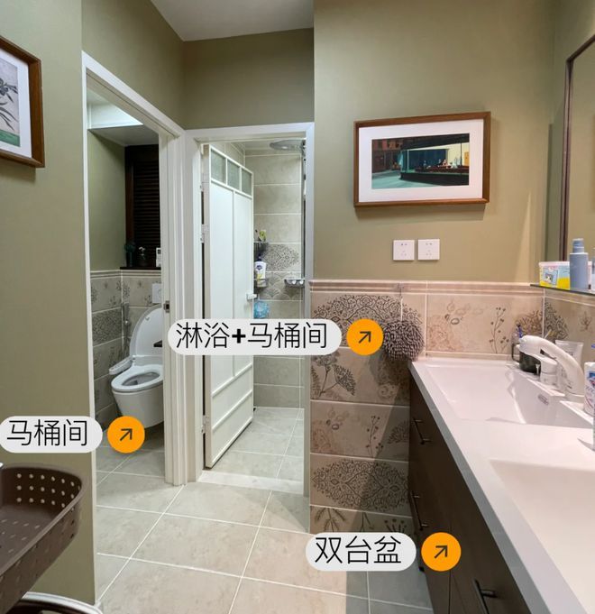 最实用的做法,就是给卫生间做三分离设计,将洗漱、淋浴、马桶全部分开,真正的完成互不干扰,方法如下。
