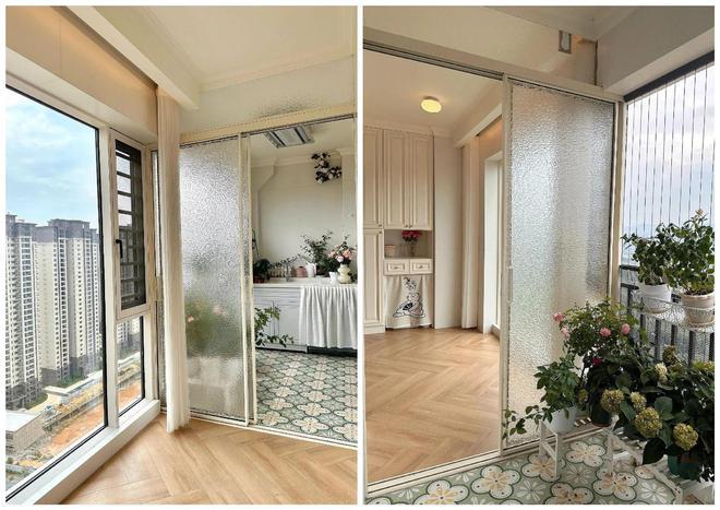3)在南阳台一边开辟出一个1㎡洗衣房,深度有个1.2m左右就够用了,最后再用玻璃门隐藏起来,一样很实用。