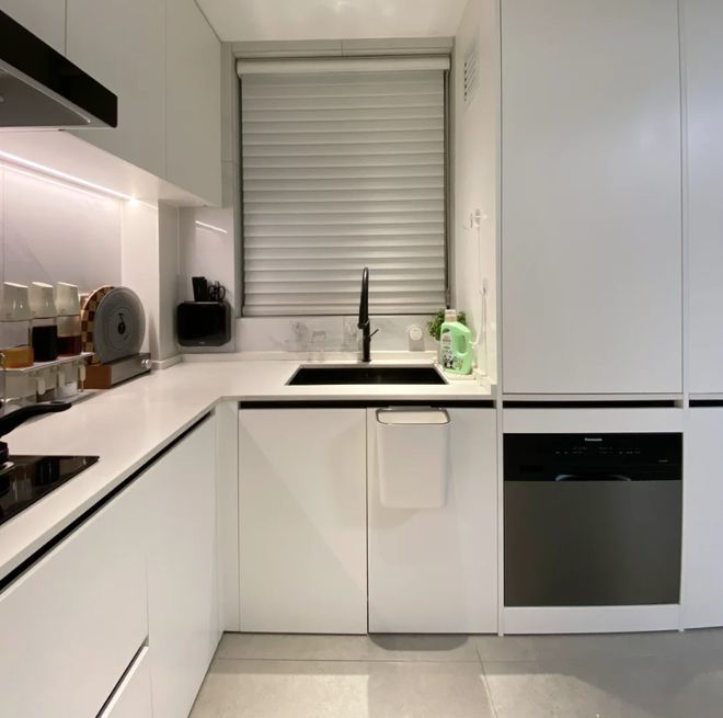 首先要在厨房里做一组高柜,然后离地70cm内嵌洗碗机,也就是比橱柜台面稍微低一点,规避弯腰使用的痛苦。