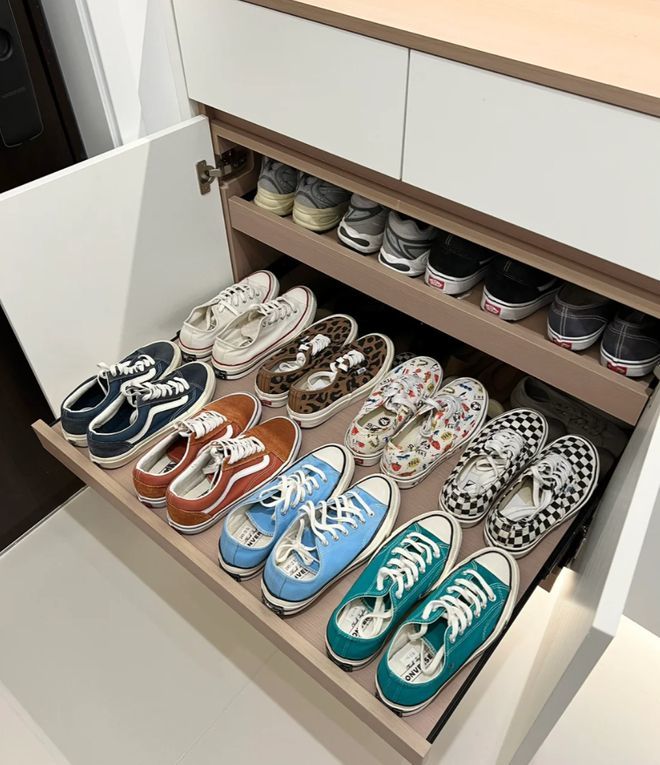 如果鞋柜的深度能做到60cm左右,那么就给隔层安装上轨道,可以放两排鞋子,不用蹲下来或趴着才能找到鞋子。